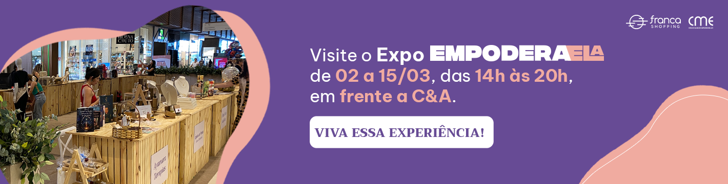 De 02 a 15 de março, venha visitar o Empodera Ela, uma ação especial que reúne empreendedoras locais e apresenta ao público uma variedade de produtos e serviços. Além de conhecer novas marcas, você poderá viver uma experiência de troca, criatividade e inspiração. Esperamos você!